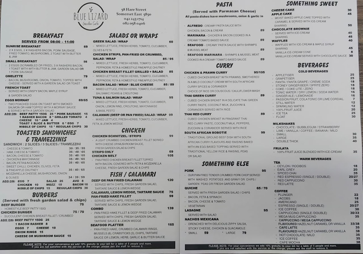 The Blue Lizard Garden Cafe offers a straightforward and inviting menu that emphasizes simple, comforting dishes and well-crafted beverages. Whether you’re stepping in for a casual lunch, a light brunch, or a relaxing coffee break, the menu provides satisfying options to complement the laid-back garden setting.