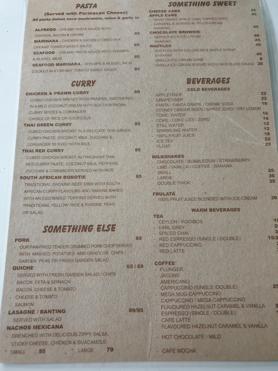 You’ll find a selection of approachable café classics alongside local favorites, such as toasted sandwiches served with chips, crumbed chicken wraps, and spiced chai. Traditional South African flavors are also present, with dishes like bobotie accompanied by peas and yellow rice, offering a nod to the region’s culinary heritage.